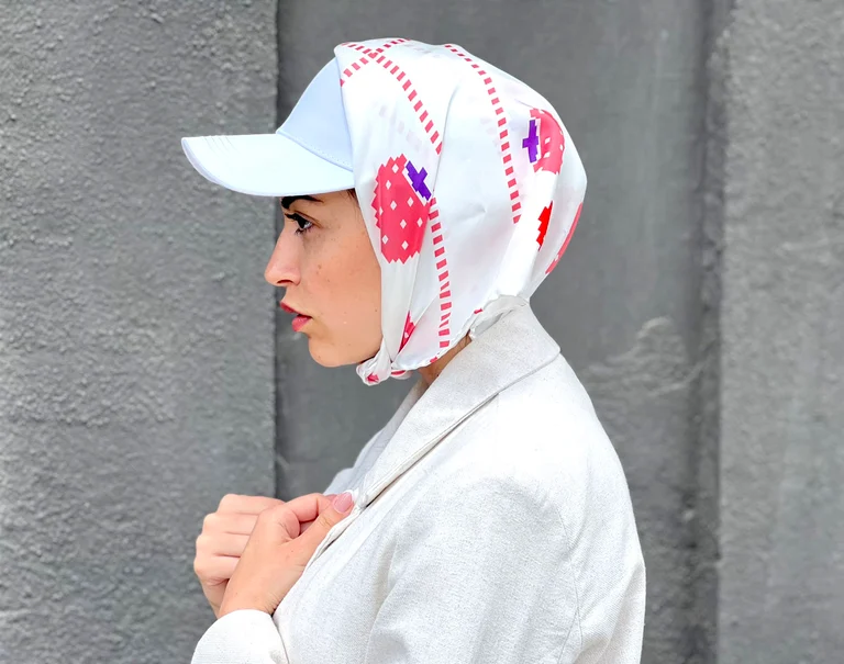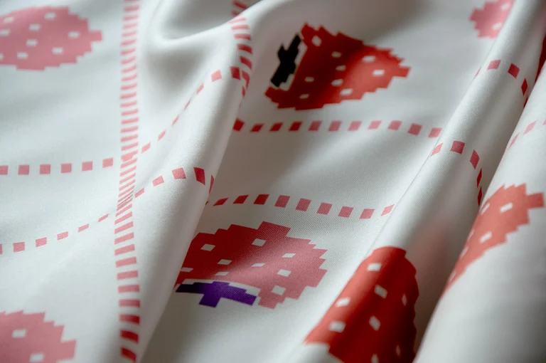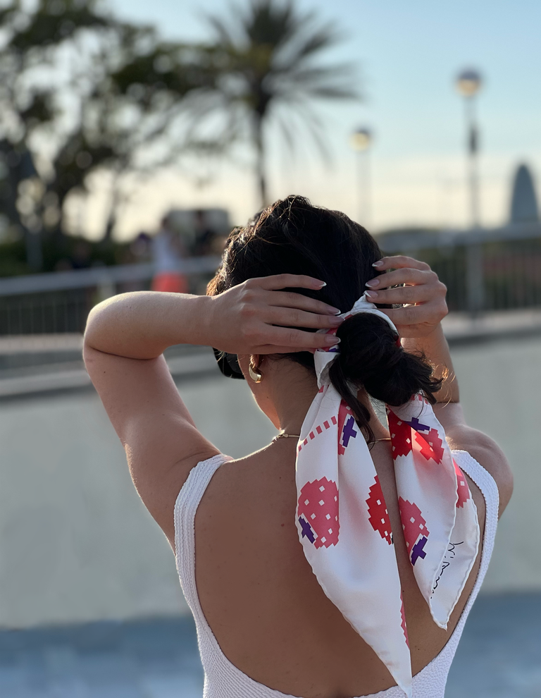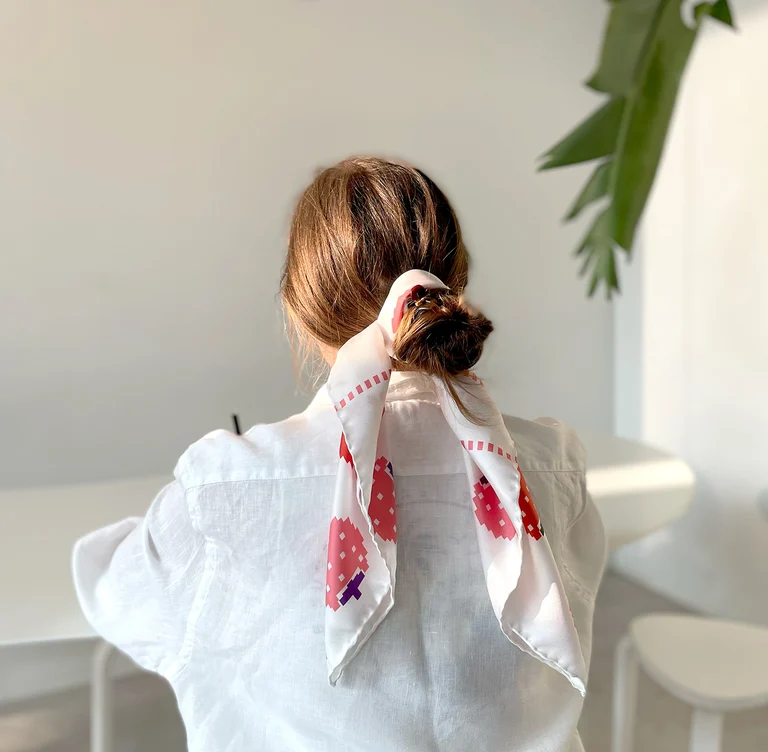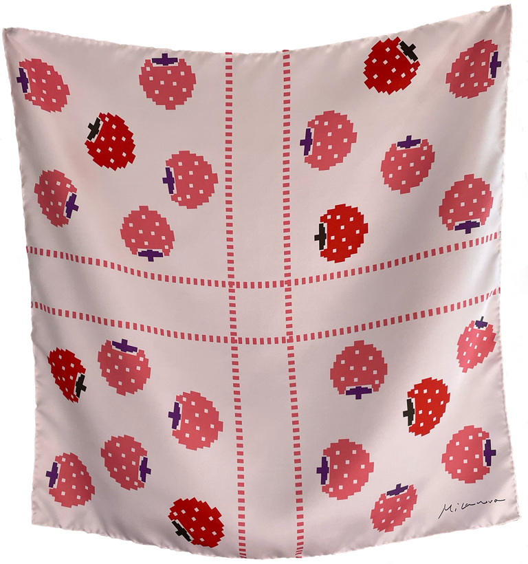Indulge in the playful charm of our ‘Berries, Berries, Strawberries’ foulard, where art meets a touch of nostalgia. The strawberries, reminiscent of pixel-made stickers, add a delightful and distinctly millennial flair. Embrace the spirit of modernity and joy with this lively accessory that brings a burst of color and fun to any ensemble.