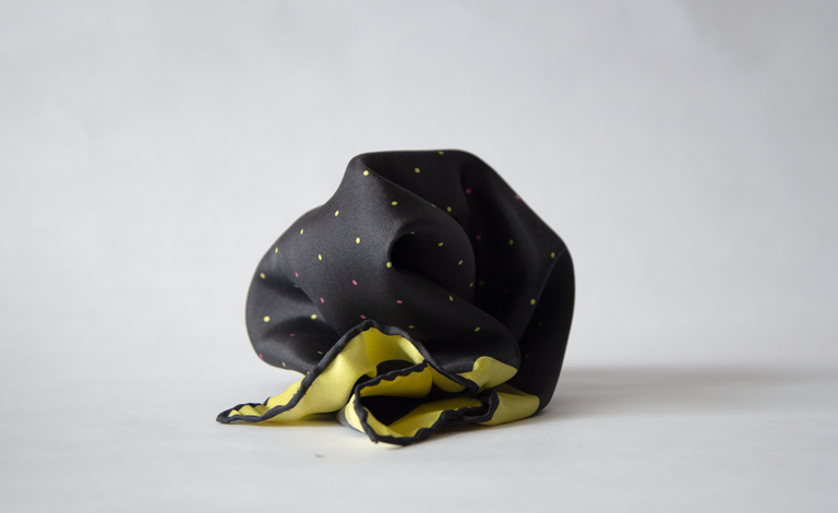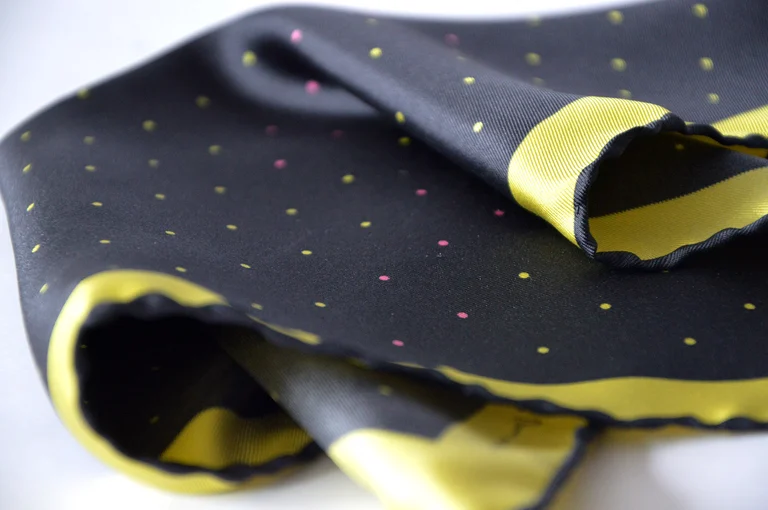 Introducing our «Funny Polka» silk pocket square, a perfect blend of elegance and playfulness. This luxurious accessory features a dark blue background complemented by a vibrant yellow border. The design is brought to life with yellow polka dots and a few whimsical pink dots, adding a touch of humor and charm to your sophisticated style.